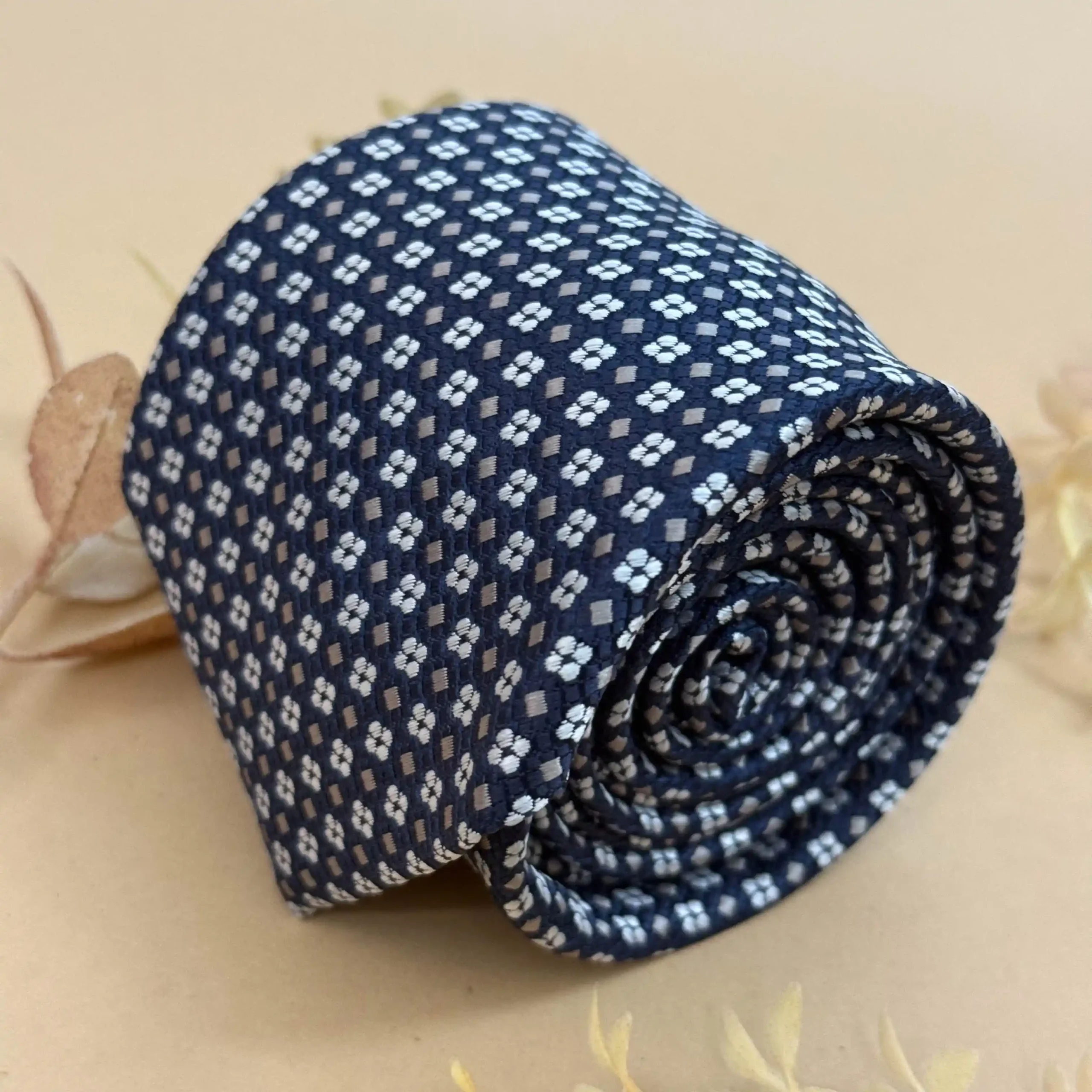 Minimal yet stylish, this navy blue tie with a compact geometric motif repeat offers subtle texture and sophistication. Perfect for everyday office wear and polished formal looks.