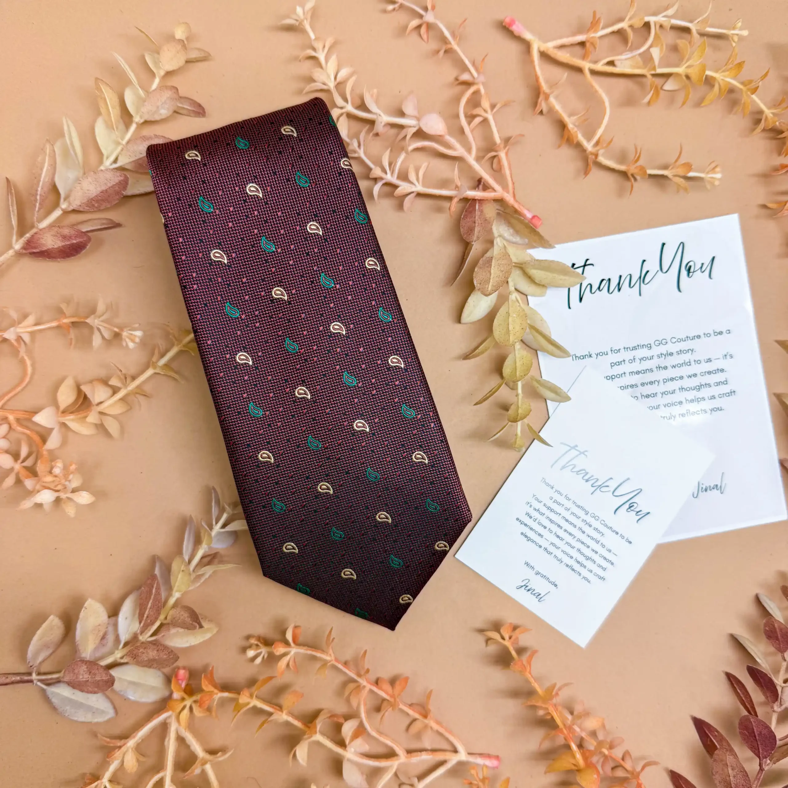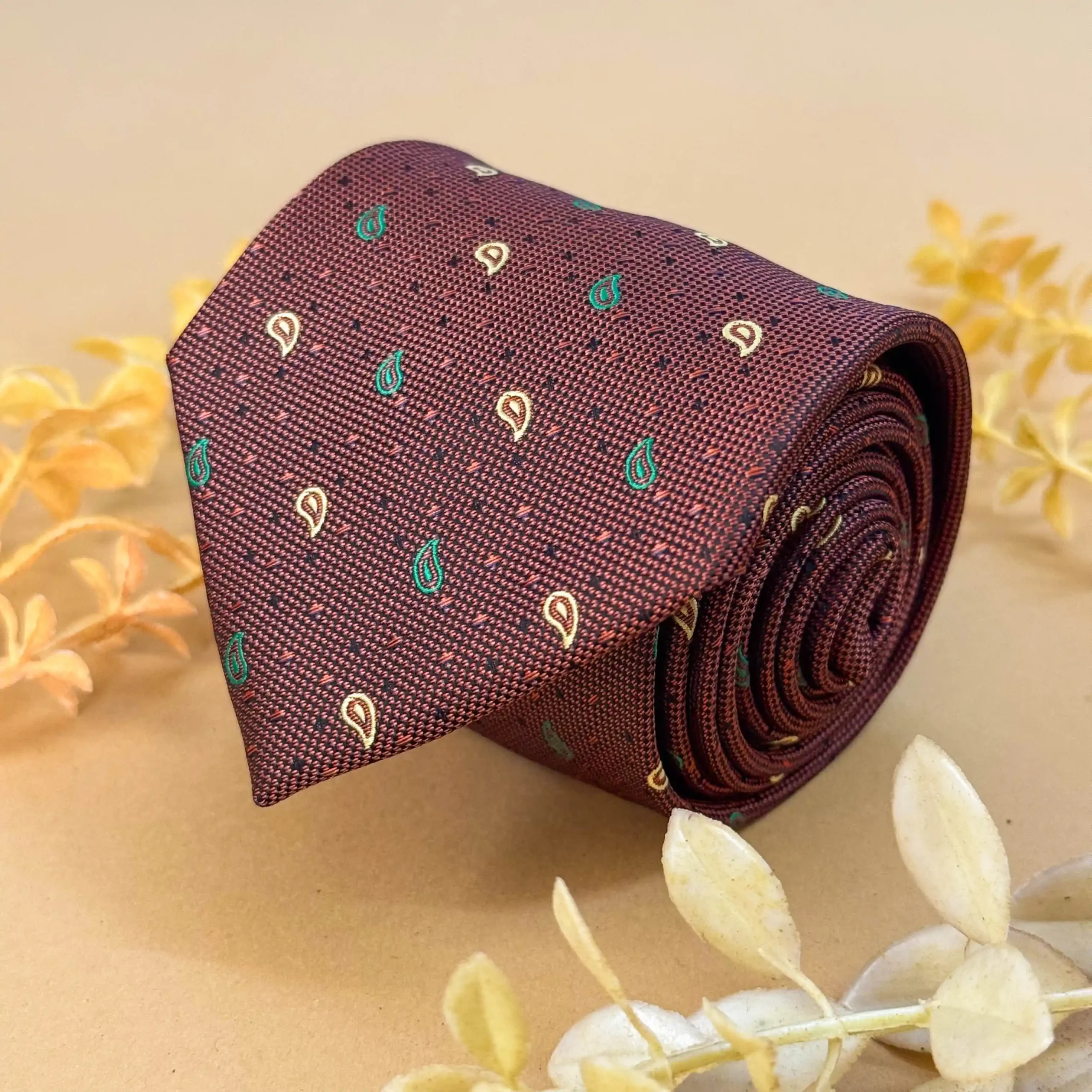 Subtle yet stylish, this brown silk tie featuring fine yellow and green paisley designs adds polished charm to formal and semi-formal outfits.