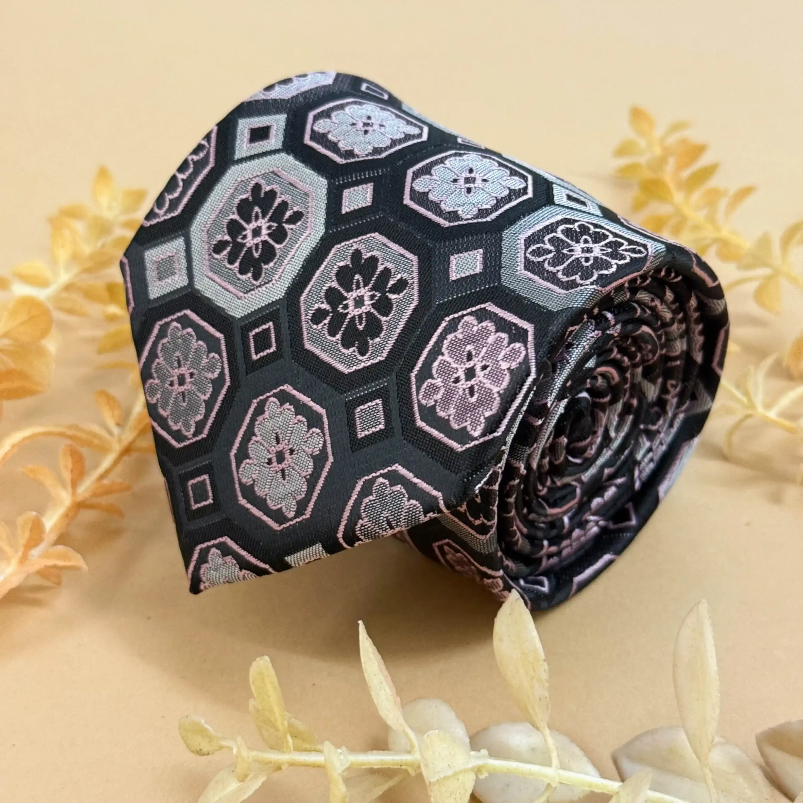 This charcoal grey silk tie showcases a bold hexagonal abstract pattern in white. A sharp, contemporary choice for business meetings and modern formal outfits.