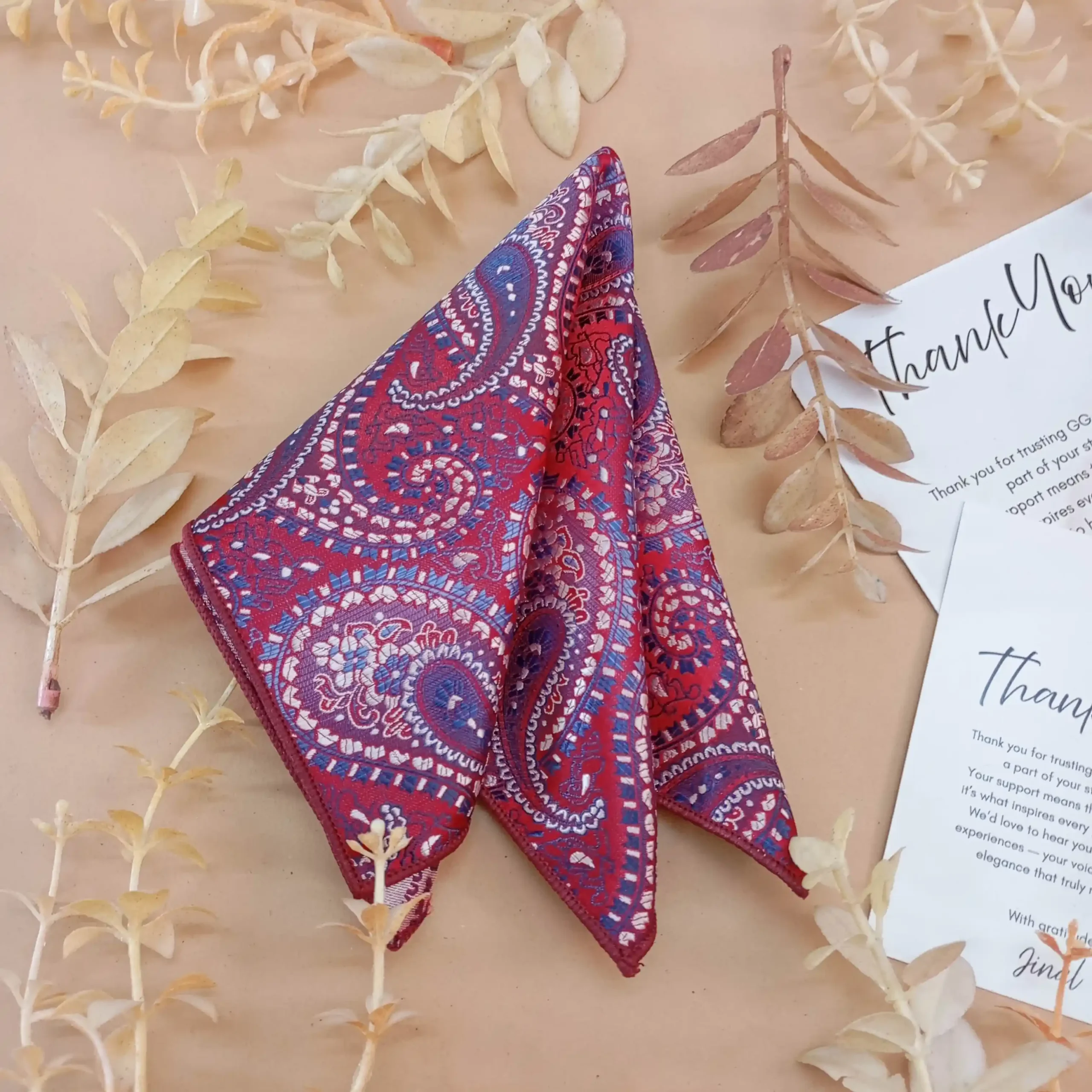 Add a bold statement to your attire with this crimson silk pocket square featuring an intricate paisley design. Its vibrant color and luxurious texture make it ideal for festive occasions or evening wear. Pair it with navy or black suits for a striking contrast that exudes confidence and elegance.