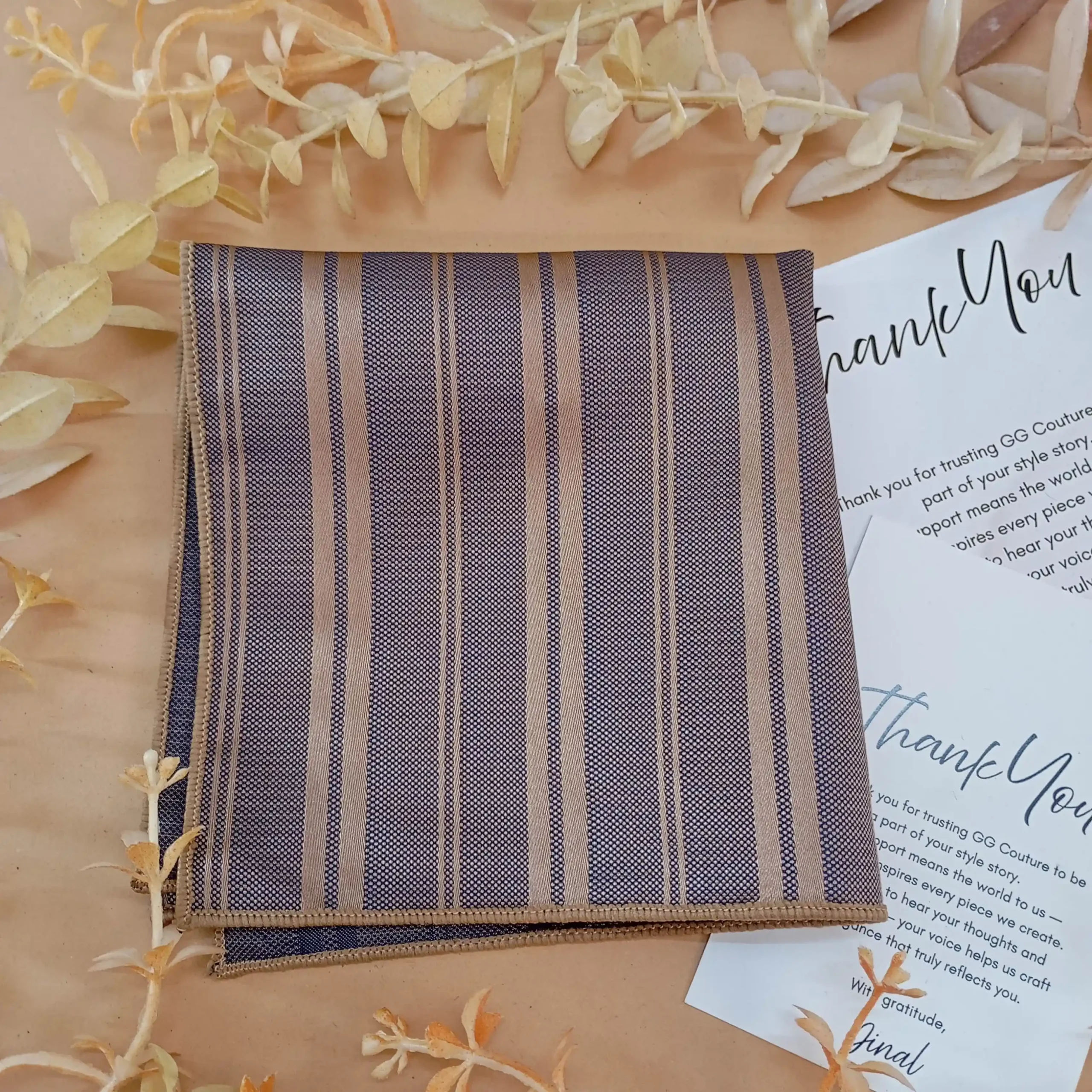 Classic and refined, this earthy toned pocket square with gold stripes adds a touch of sophistication to your attire. Ideal for business meetings or evening wear, it pairs well with earth-toned suits. A timeless piece for those who appreciate subtle luxury.