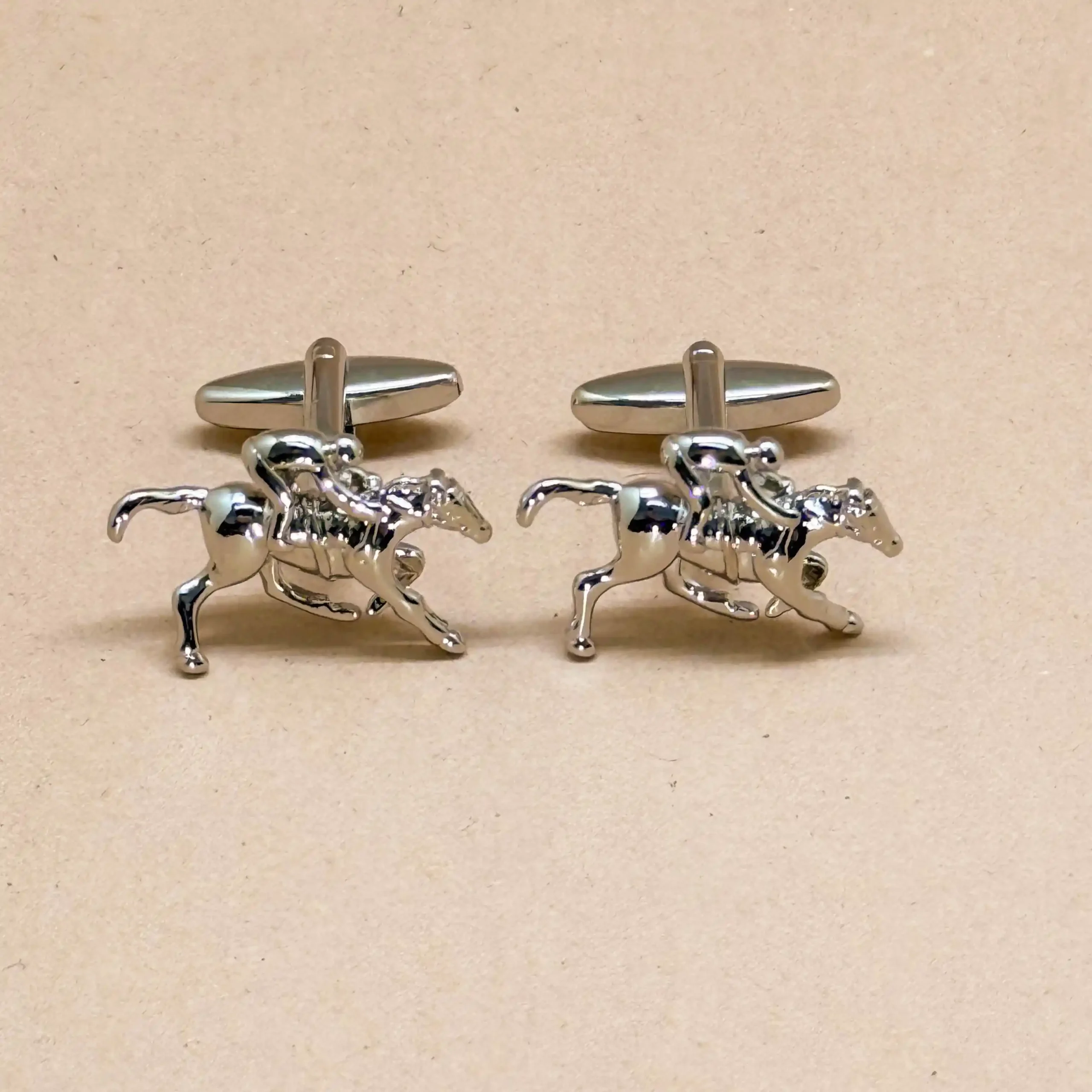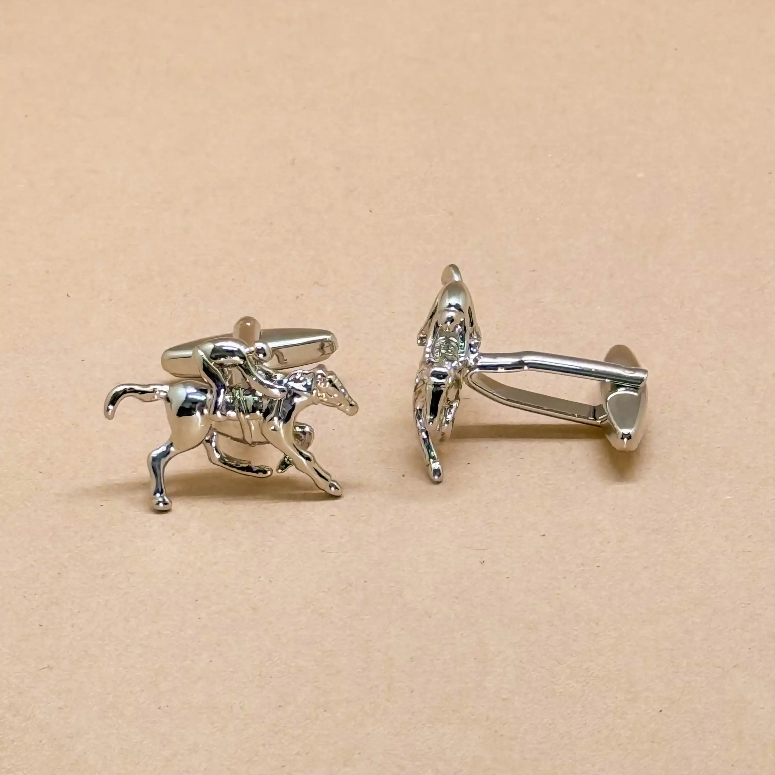 Celebrate the spirit of equestrian elegance with these silver cufflinks featuring a detailed horse and rider design. Perfect for horse lovers, polo enthusiasts, or those who appreciate classic sporting heritage. Pair them with tailored suits for a refined, aristocratic look that speaks of tradition and style. A luxurious accessory that blends artistry with timeless sophistication.