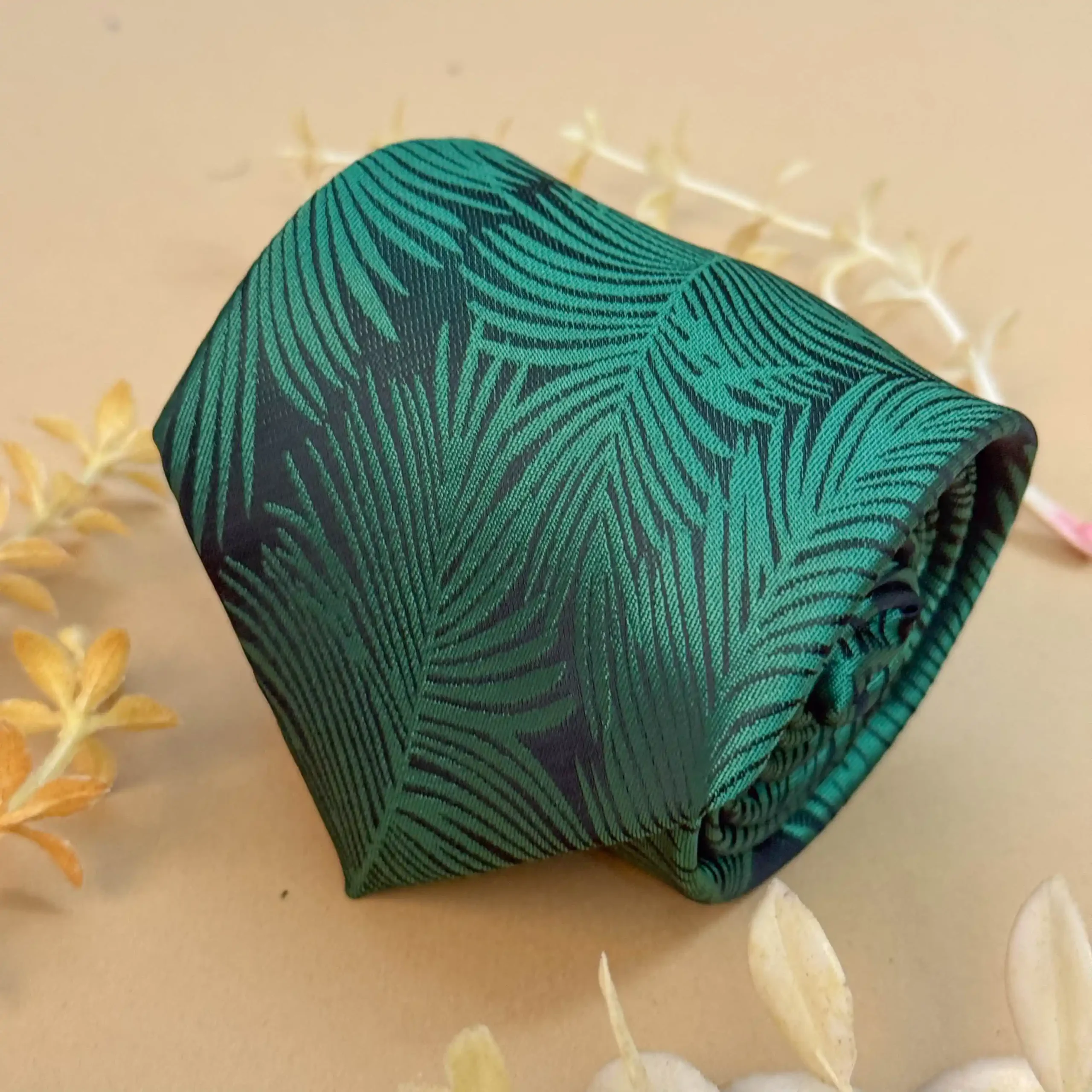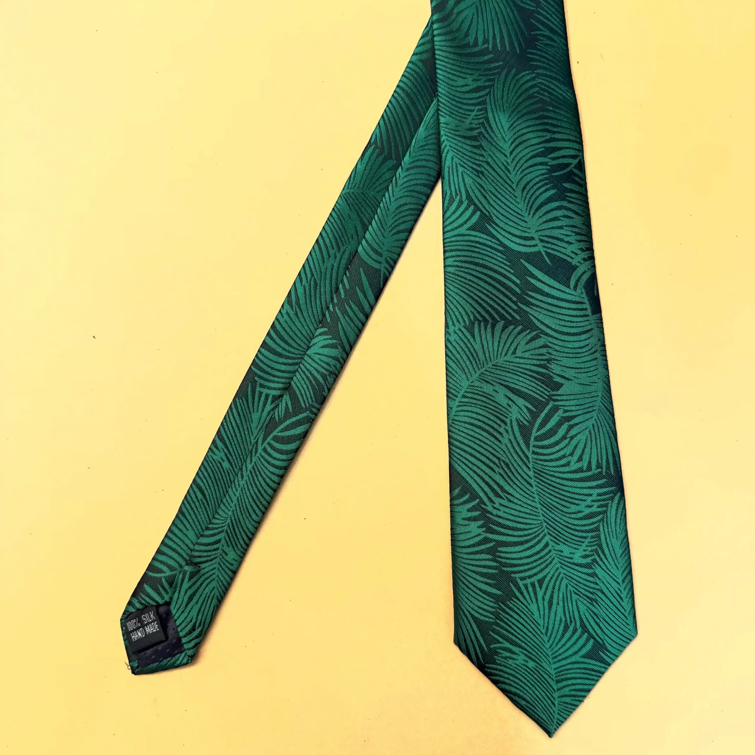 A fresh green silk tie featuring a flowing palm inspired abstract design. Ideal for destination weddings, summer formals, and refined festive looks.