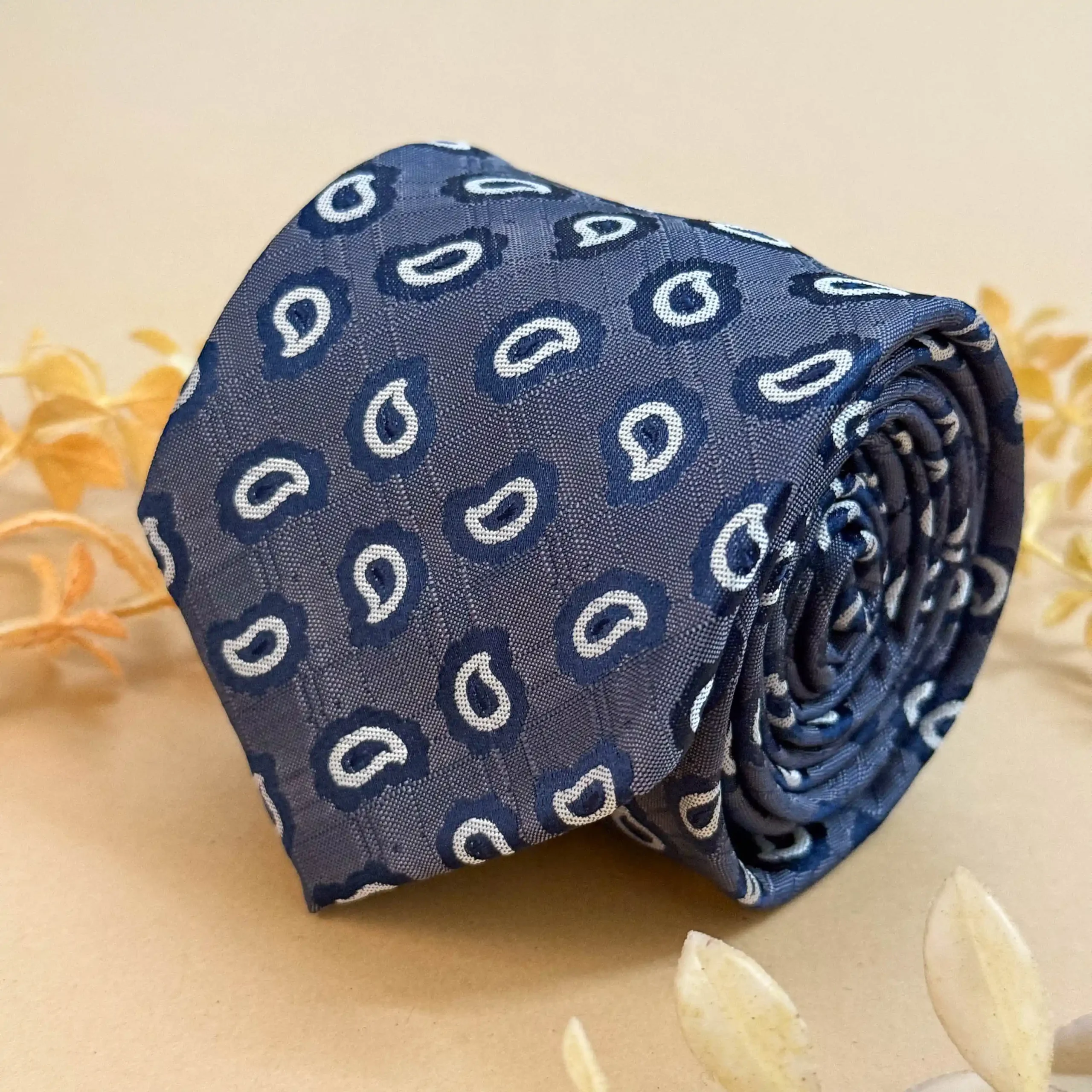 Sophisticated and versatile, this grey tie enriched with blue and white paisley patterns is ideal for office wear and premium formal occasions.