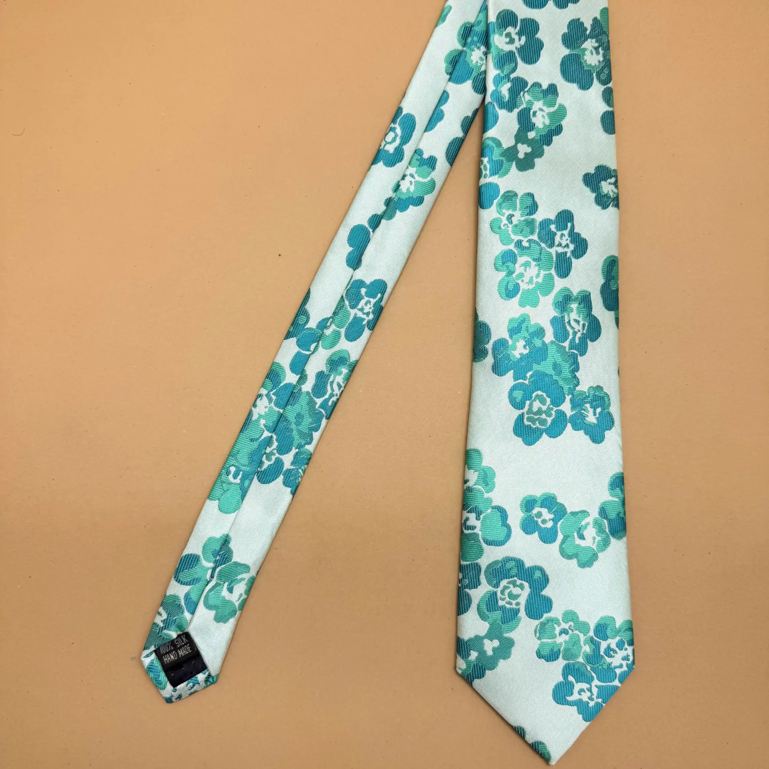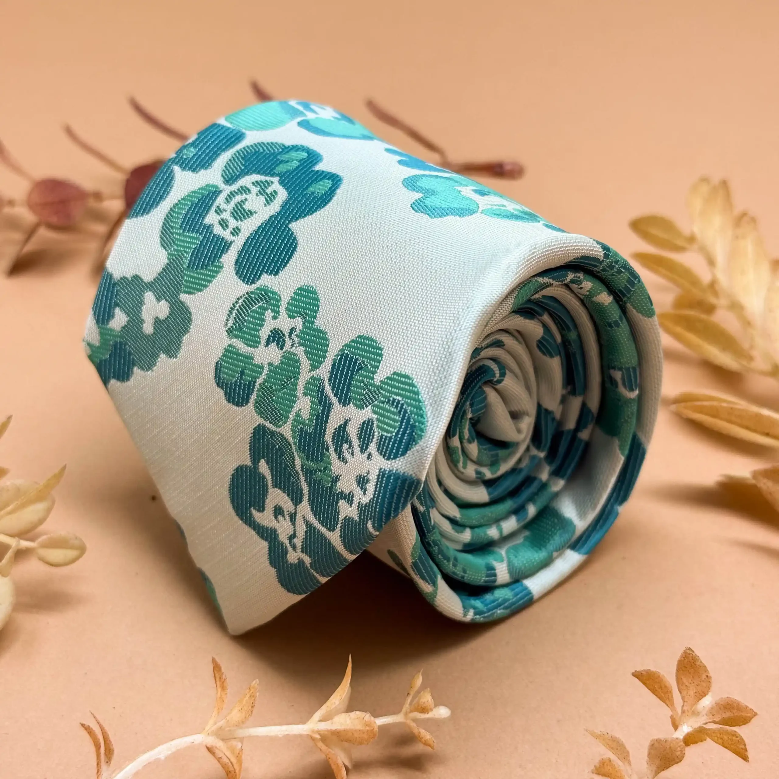 Crafted on a clean ivory base, this silk tie features graceful teal floral designs. A sophisticated choice for summer formals, destination weddings, and elegant daytime occasions.