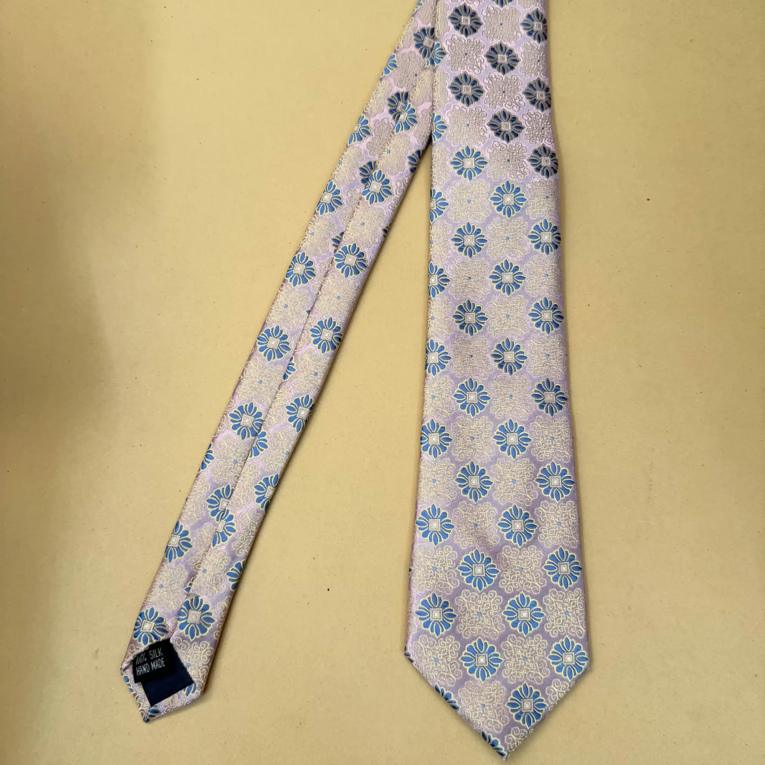 An elegant ivory silk tie highlighted with subtle blue medallion style abstracts. Perfect for daytime events, weddings, and sophisticated summer dressing.