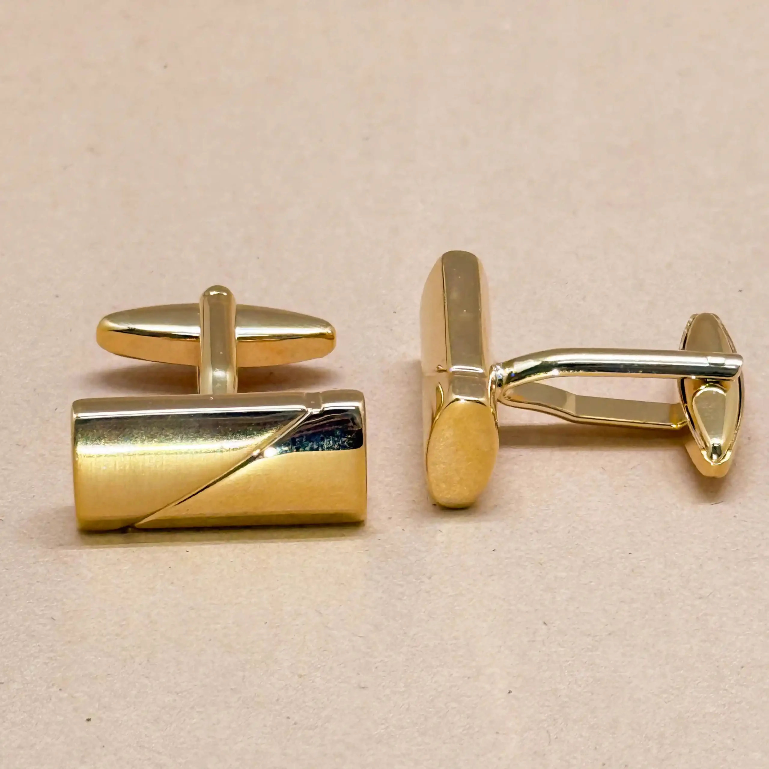 Sleek and contemporary, these gold cufflinks feature a subtle stripe design for a refined finish. Their minimalist aesthetic makes them versatile, perfect for both professional settings and evening events. Pair them with tailored suits for a polished, understated look that speaks volumes about your style. Crafted with precision, these cufflinks are a modern classic for the discerning gentleman.