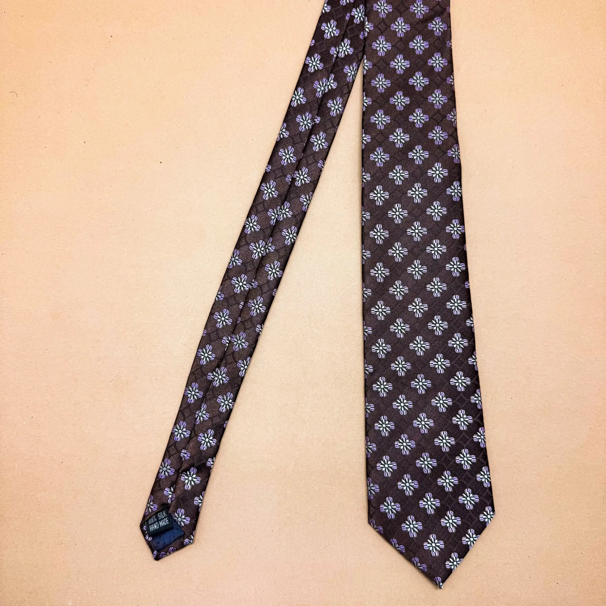 A refined mocha-brown silk tie featuring a soft grid inspired abstract design. Ideal for professional wear and understated formal styling with a modern edge.