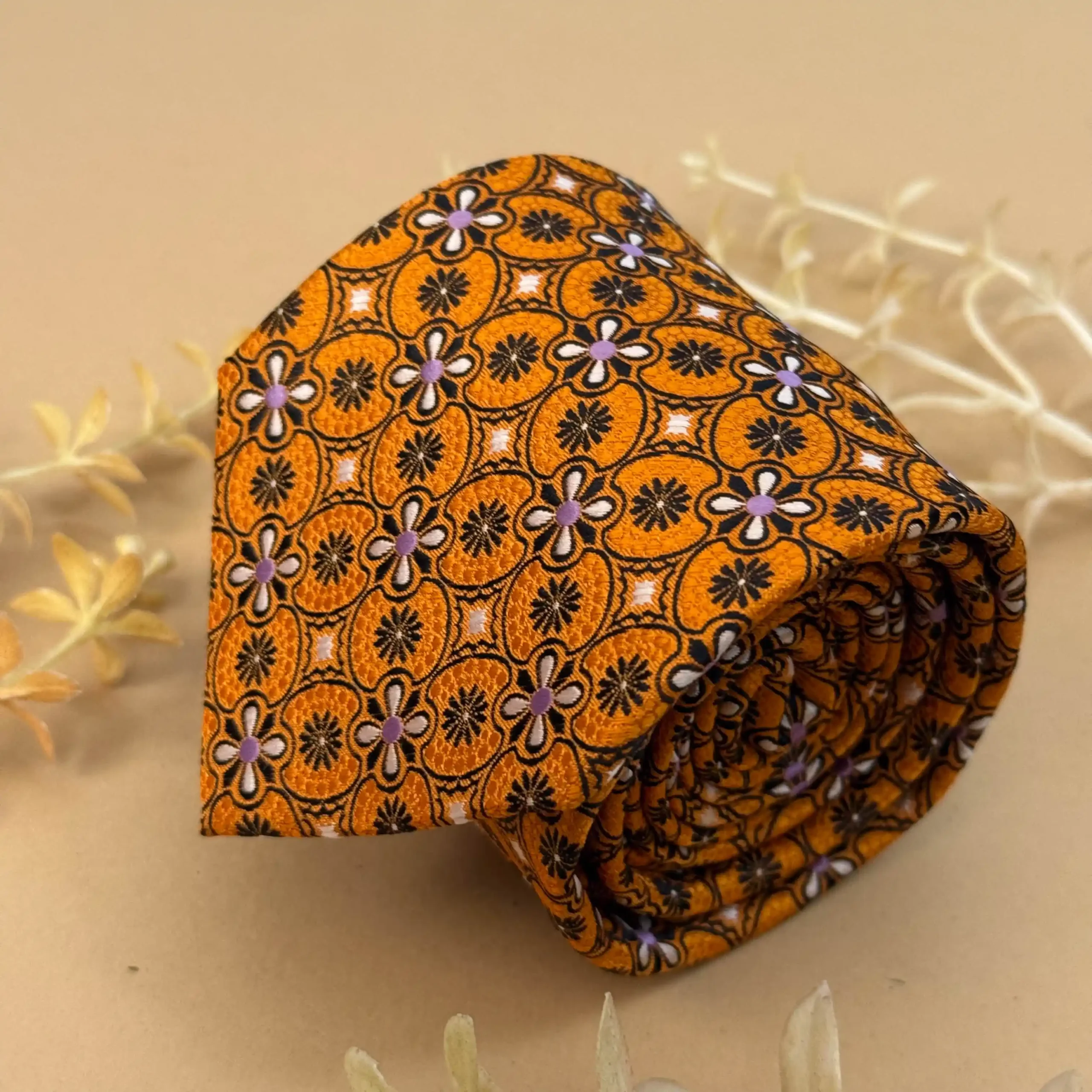 Add bold elegance to your outfit with this mustard tie featuring a small geometric floral pattern. Ideal for festive styling and standout formal looks, it brings warmth and charm to your attire.