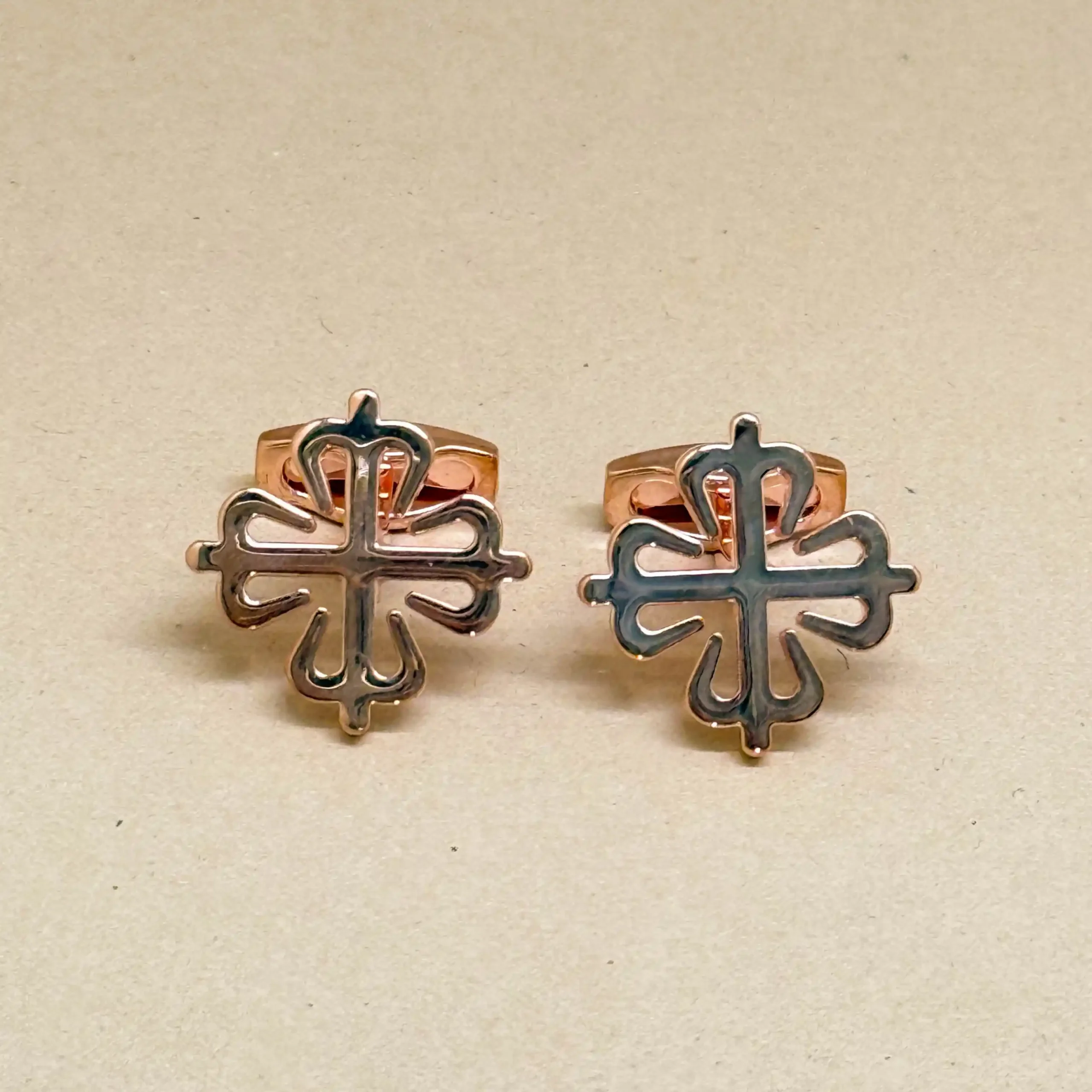 Bold and distinctive, these rose gold cufflinks feature an intricate cross motif that symbolizes strength and heritage. Their polished finish and artistic detailing make them a standout accessory for formal occasions or themed events. Pair them with a classic suit for a look that exudes confidence and individuality. A timeless piece for those who appreciate meaningful design and luxury.