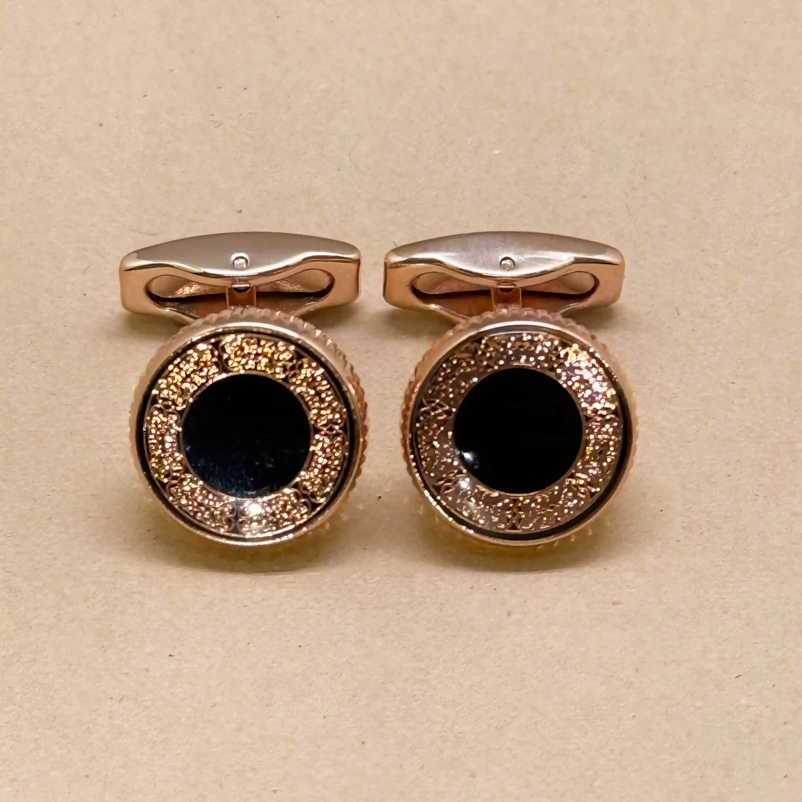 Exuding timeless elegance, these rose gold cufflinks feature a bold black onyx center framed by a sparkling crystal halo. The warm rose gold tone adds a modern twist to classic sophistication, making them perfect for weddings, or high-profile meetings. Pair them with a crisp white shirt and a tailored suit for a look that radiates confidence and luxury. Crafted with precision and durability, these cufflinks are a statement of refined taste.