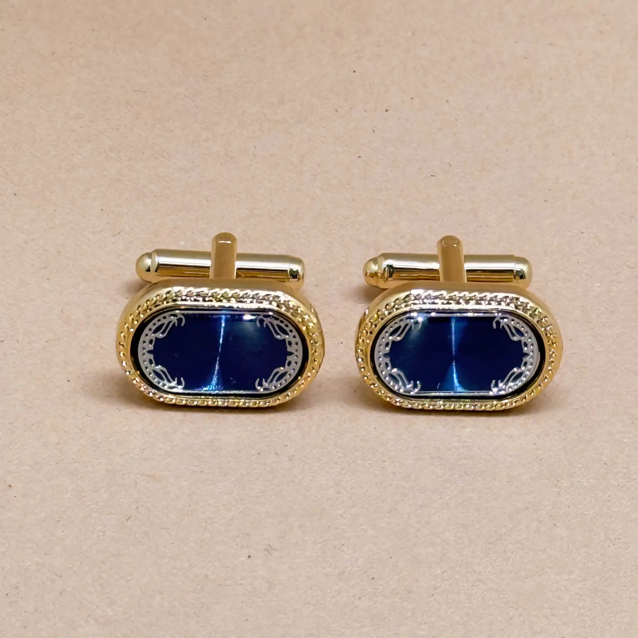 Exuding regal charm, these gold cufflinks feature deep sapphire blue stones framed in a sleek oval design. The rich color and luxurious finish make them perfect for high-profile events. Pair them with a crisp white shirt and a navy suit for a coordinated, commanding look. Crafted for durability and brilliance, these cufflinks are a true statement of aristocratic elegance.