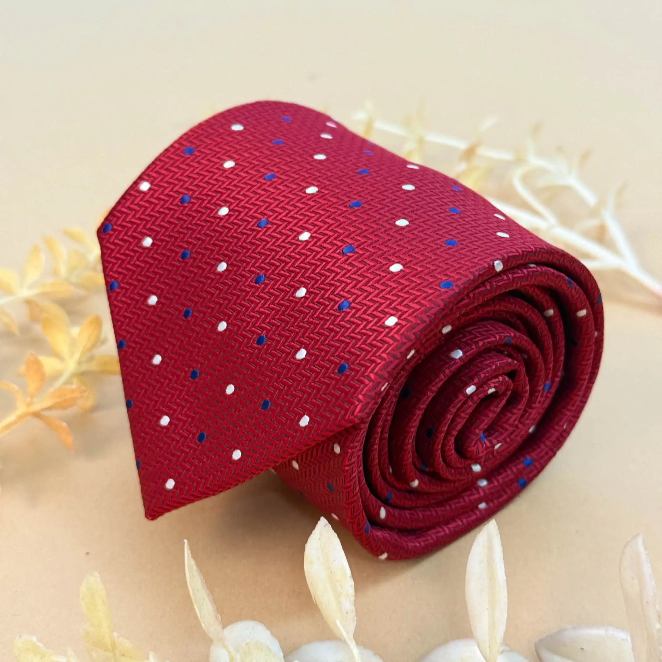 Bold yet elegant, this red tie accented with crisp white and blue micro dots is ideal for festive and formal styling. Its vibrant color and intricate detailing make it a versatile choice for standout looks.