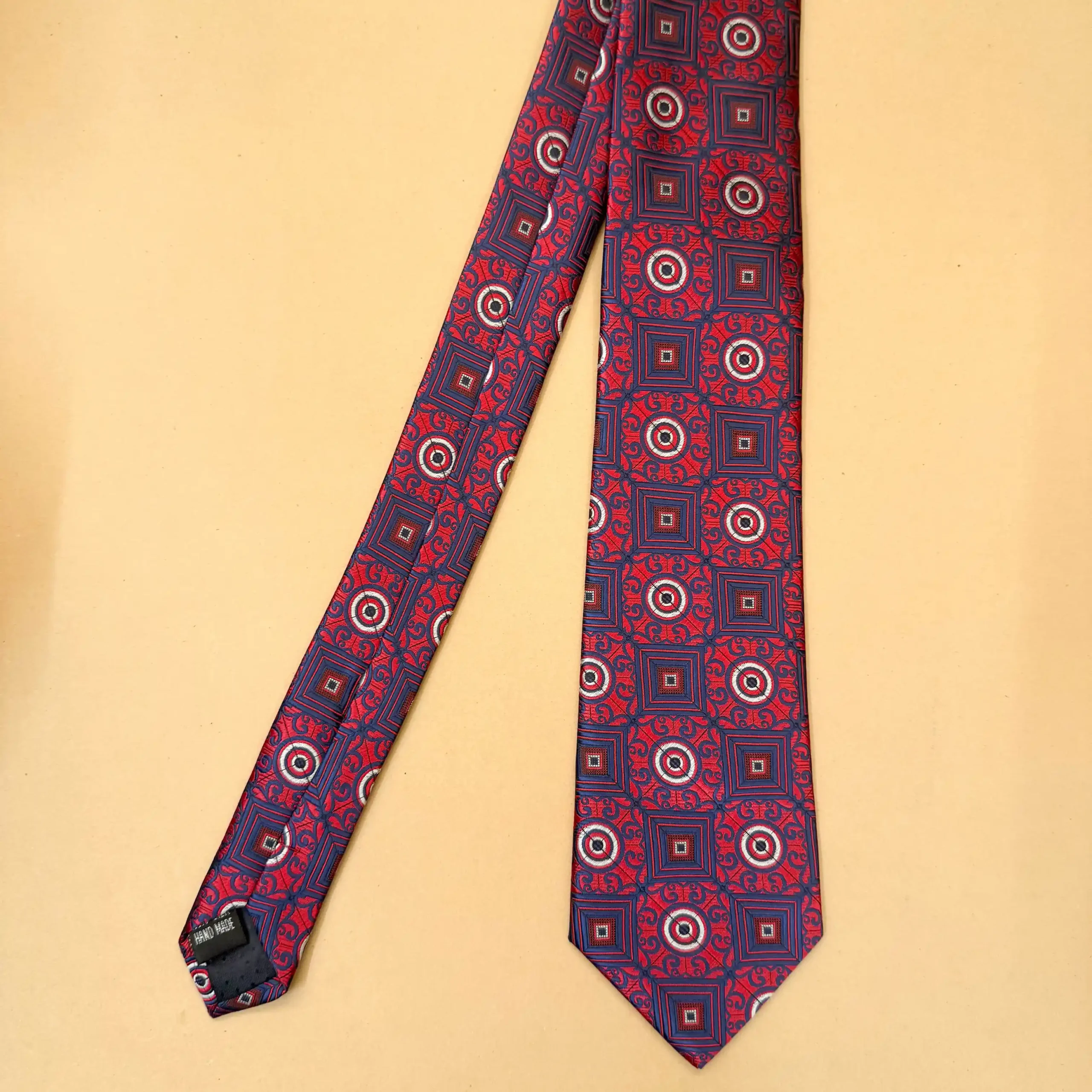 A bold abstract silk tie featuring geometric shapes in rich red and navy blue tones. Perfect for expressive styling and premium statement looks.