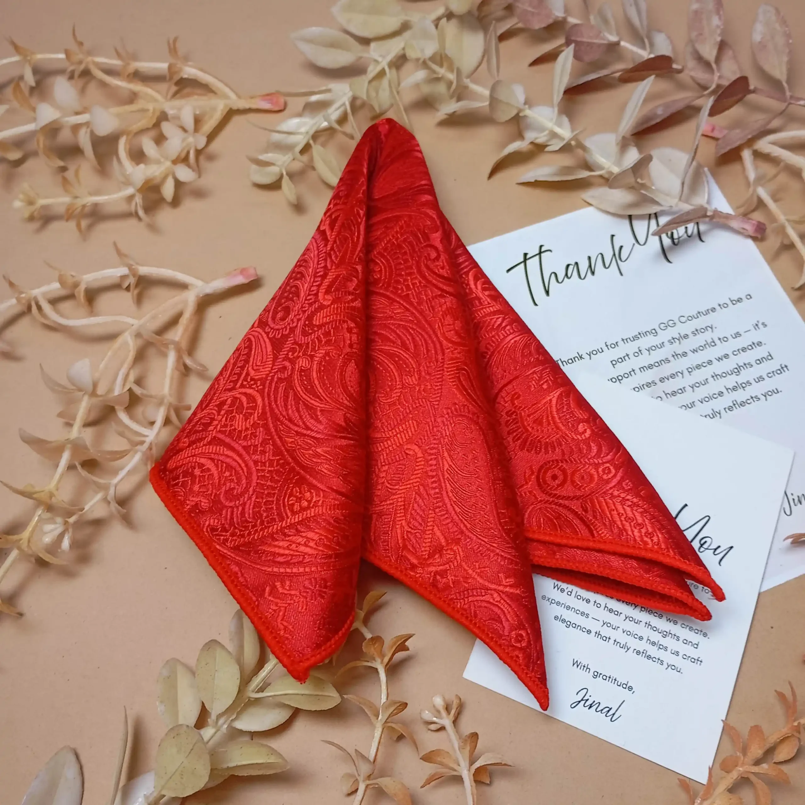 Make a bold statement with this scarlet red pocket square featuring an intricate paisley pattern. Perfect for festive occasions or adding flair to classic suits, it pairs beautifully with black or navy. A luxurious accessory for those who love vibrant elegance.