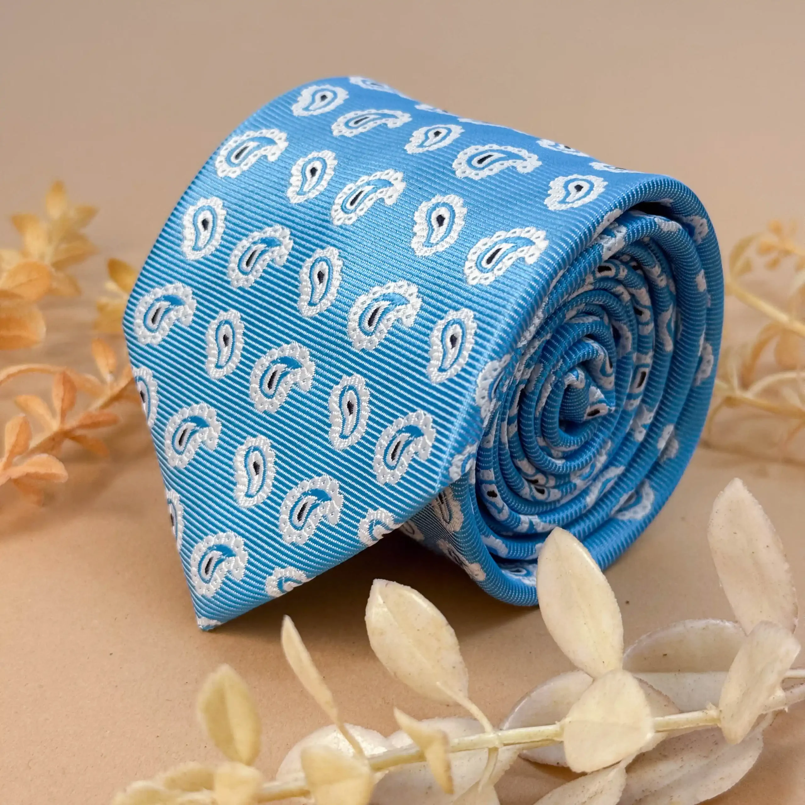 Bright and elegant, this sky blue silk tie detailed with delicate white paisley motifs is perfect for weddings, daytime events, and summer celebrations.