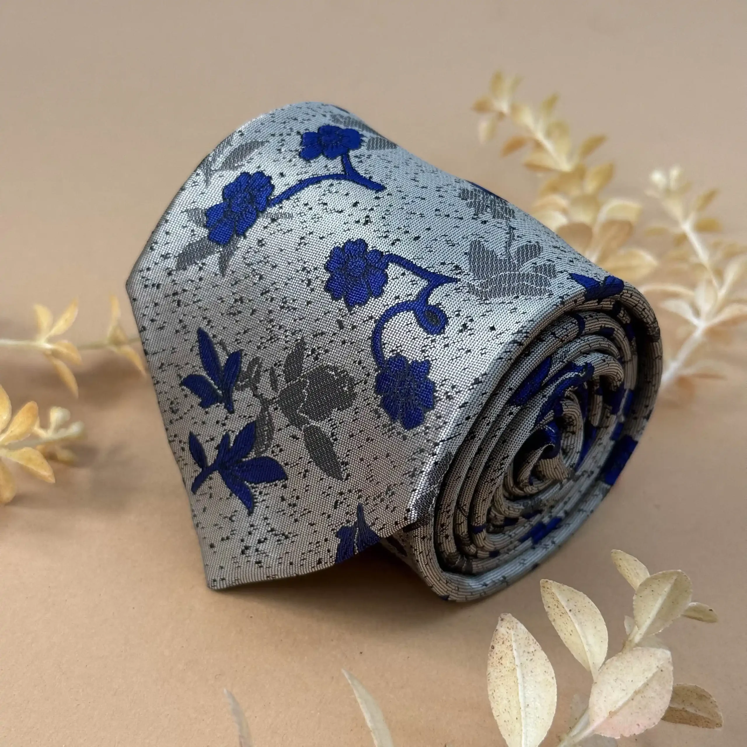 Soft and sophisticated, this slate grey silk tie features elegant navy floral patterns. Perfect for weddings, daytime functions, and refined seasonal styling.
