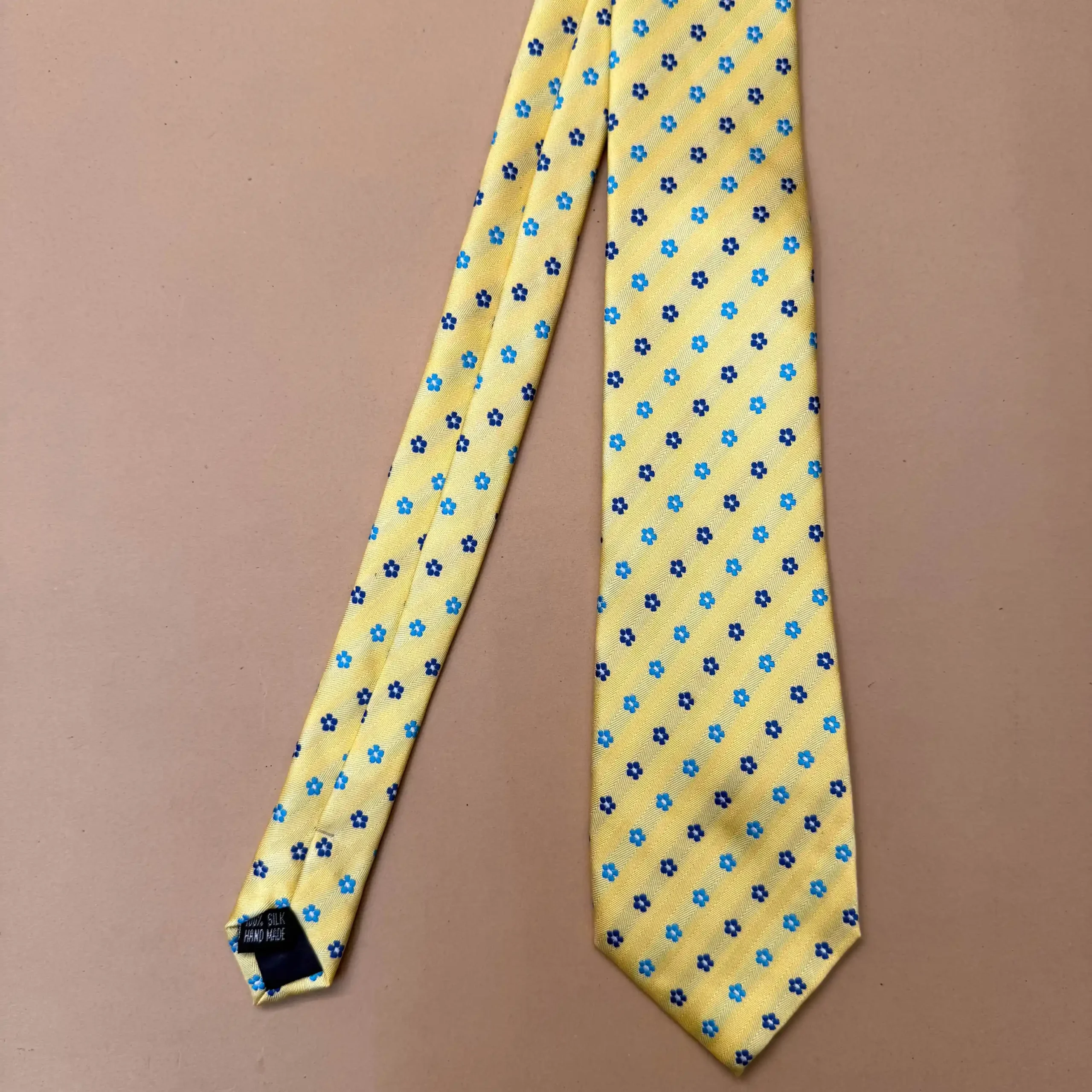 Bright and refreshing, this yellow silk tie adorned with dainty blue floral shapes is perfect for weddings and summer events. Its cheerful design adds a lively touch to formal dressing.